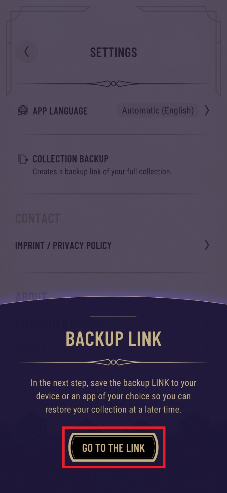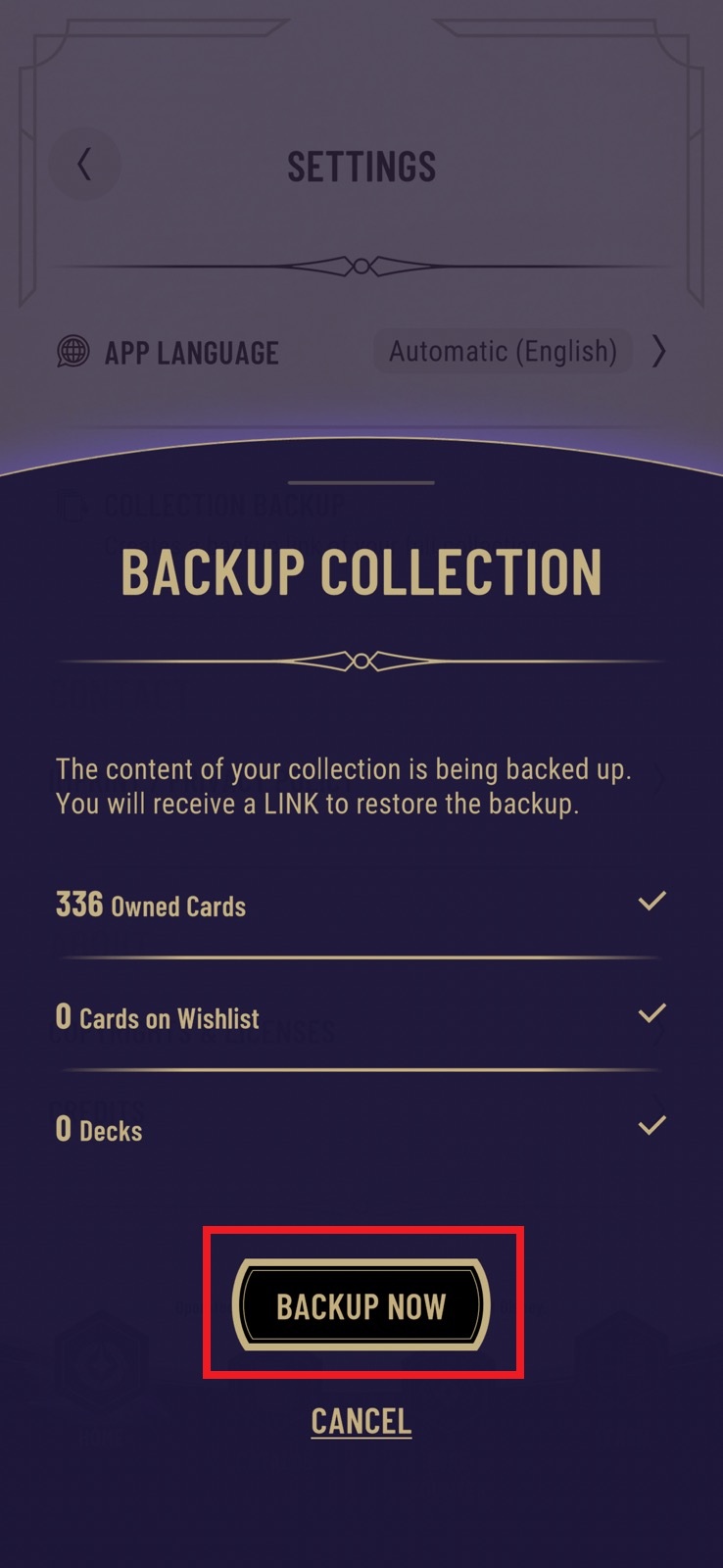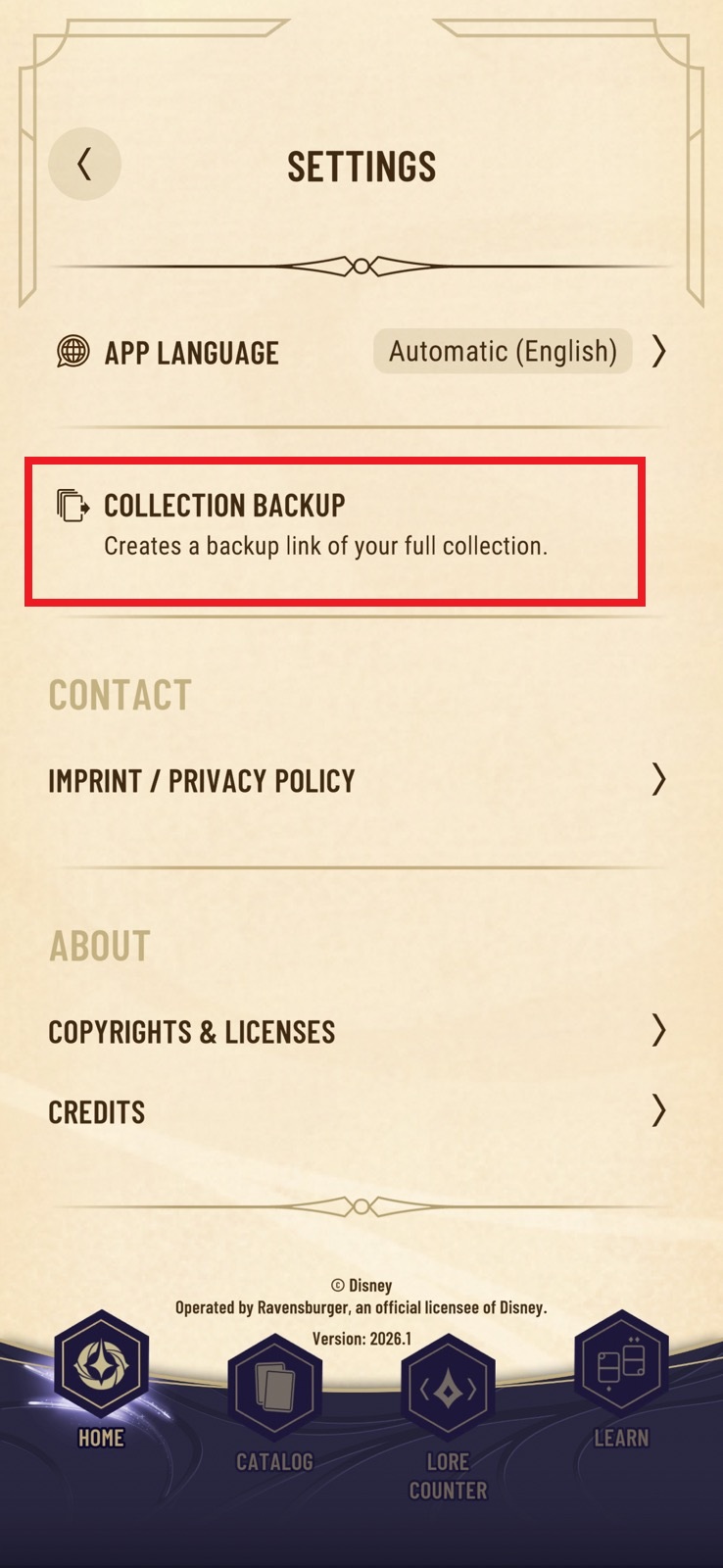 Open official Lorcana TCG app and find backup url (see screenshots below). Go to link will let you save text file, in which there is the url.